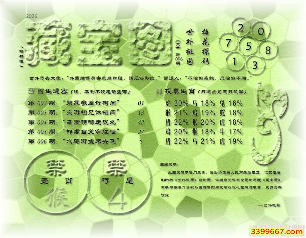 006期藏寶圖 新:欲往宁辞沔水深 老:水鸡衔鱼来去飞 禁:猴 禁:4尾