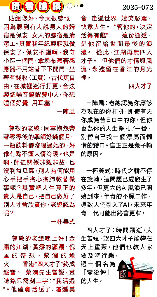 3.尊敬的老總晚上好!金庸的江湖、黃露的瀟灑、倪匡的奇想、蔡瀾的煙火一香港“四大才子”終成絕響。蔡瀾先生曾說,墓諾銘只需刻三字:“我活過”。他確實活透了:嚐遍美食, 走遍世界,嬉笑怒罵,快意人生。”管他的,決定活得有趣”— —這份通透,是他留給世間最後的浪漫。從此,江湖再無四大才子。但他們的才情與風流,永遠留在香江的月光裡。====四大才子