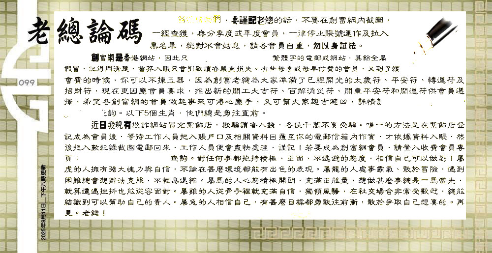 主题 :099期:六合皇金句/老总论码/萧公子/林大师/五行夺码/老总信箱截 |