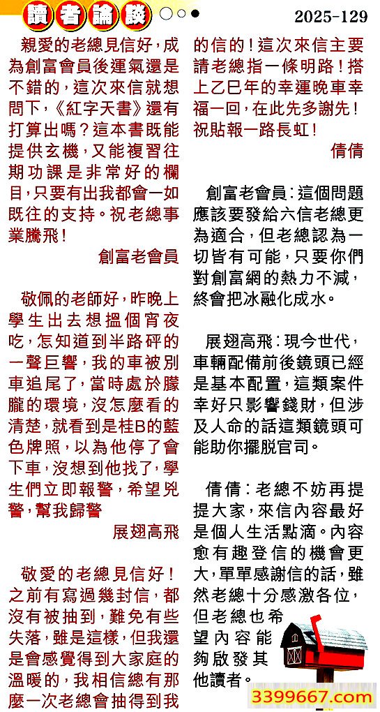 1.親愛的老總見信好,成為創富會員後運氣還是不錯的,這次來信就想問下,《紅字天書》還有打算出嗎?這本書既能提供玄機,又能複習往期功課是非常好的欄目,只要有出我都會一如既往的支持。祝老總事業騰飛!====創富老會員