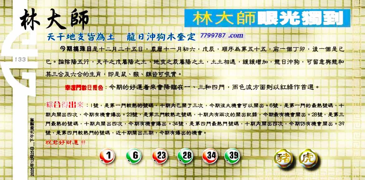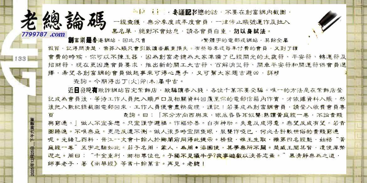 | 主题 :133期:六合皇金句/老总论码/萧公子/林大师/五行夺码/老总信箱截 |