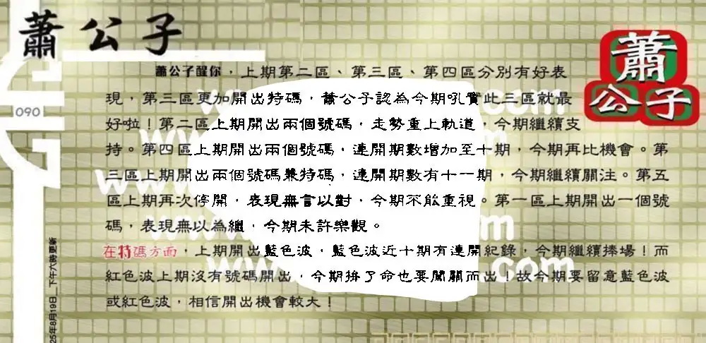 | 主题 :090期:老总论码/萧公子/林大师/五行夺码 |