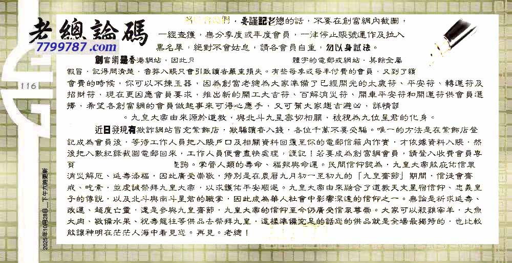 | 主题 :116期:六合皇金句/老总论码/萧公子/林大师/五行夺码/老总信箱截 |