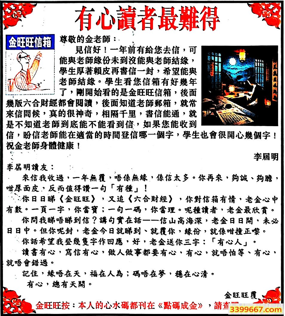 | 主题 :117期:金旺旺信箱彩民推荐→→《有心讀者最難得》 |
