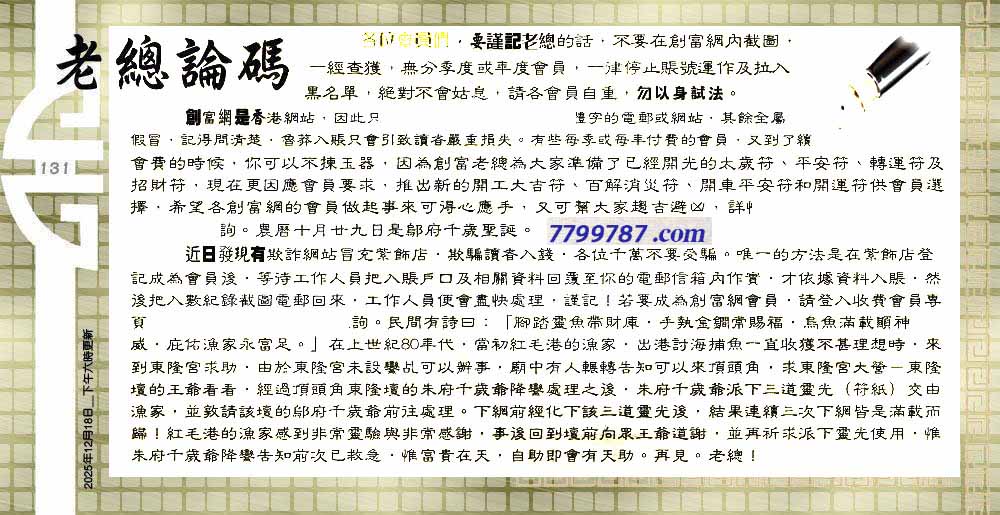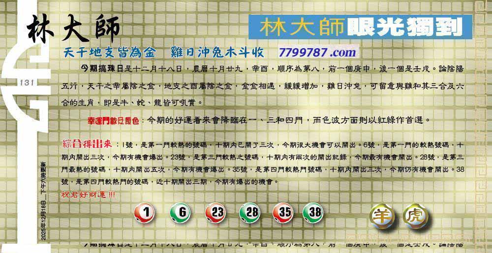 | 主题 :131期:六合皇金句/老总论码/萧公子/林大师/五行夺码/老总信箱截 |