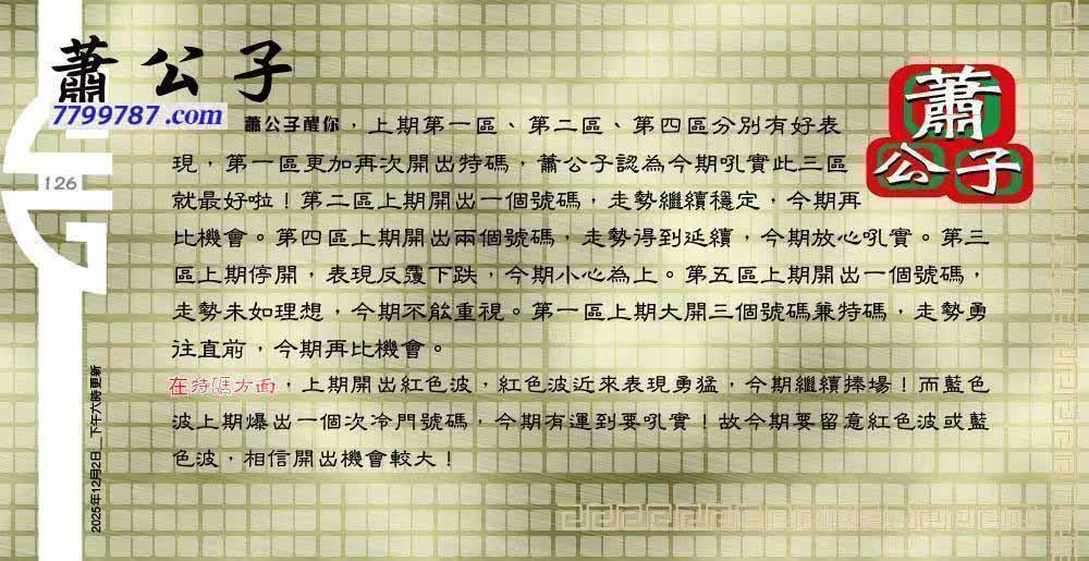 | 主题 :126期:六合皇金句/老总论码/萧公子/林大师/五行夺码/老总信箱截 |