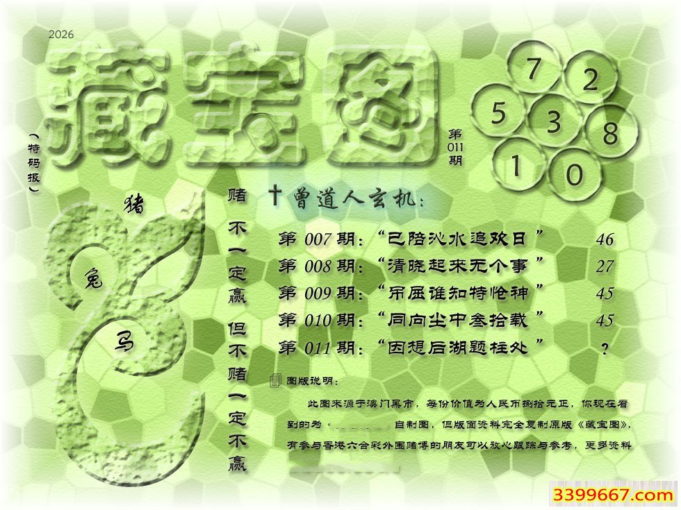 | 主题 :011期藏寶圖 新:因想后湖题柱处 老:汉城黄柳映新帘 禁:虎 禁:4尾 |