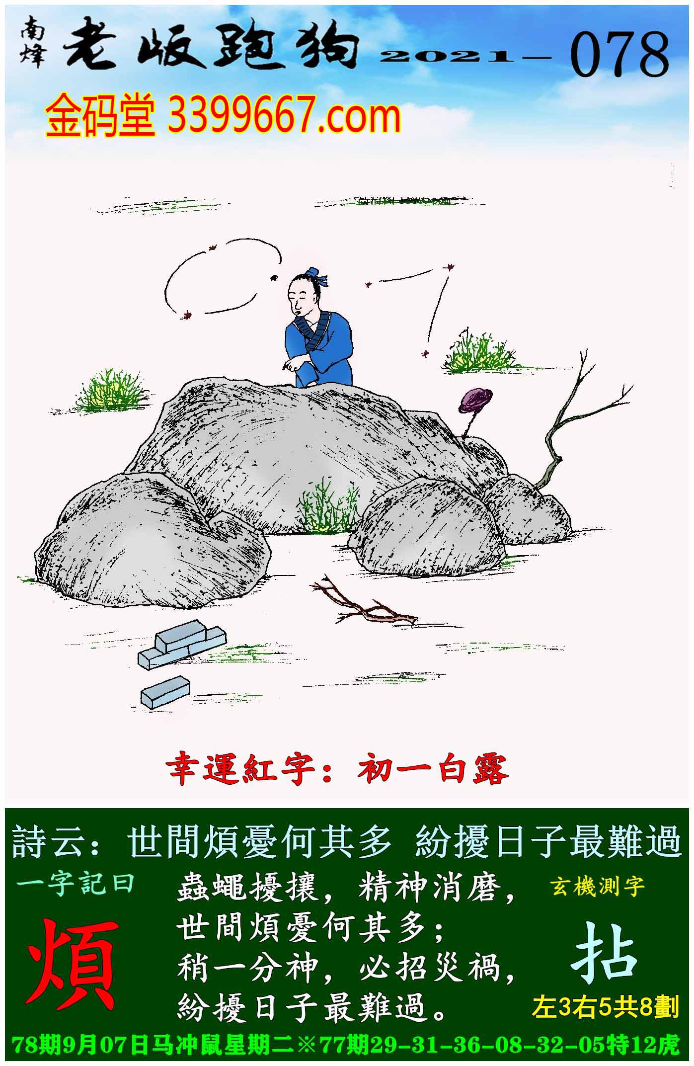 078期老版跑狗一字記之曰:【煩】玄機測字:《拈》