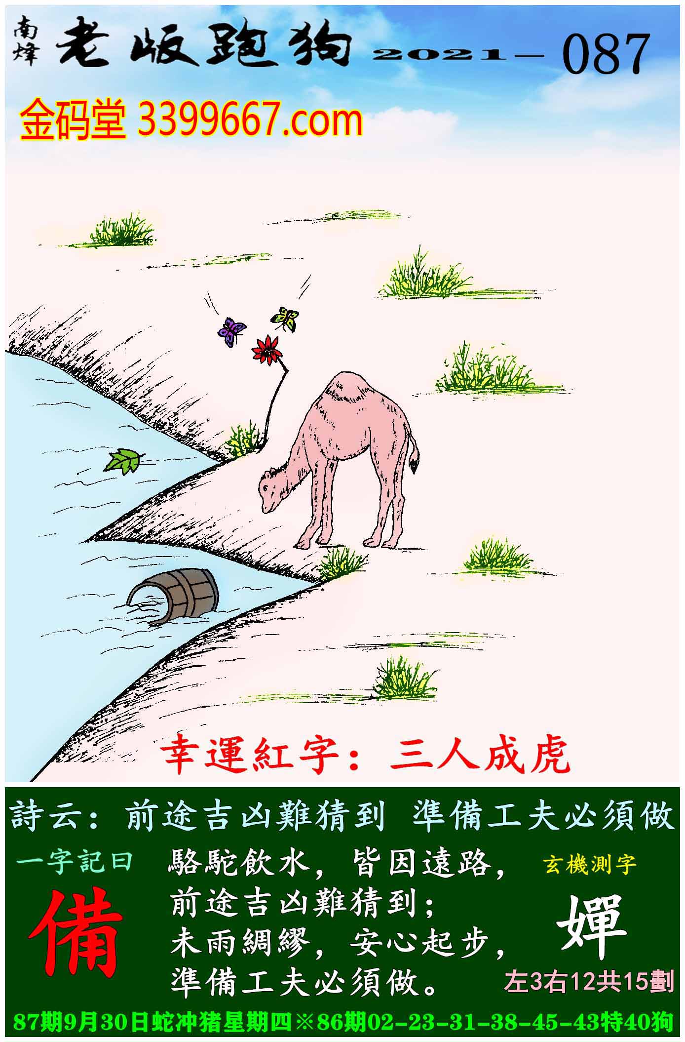 087期老版跑狗一字記之曰:【備】玄機測字:《嬋》