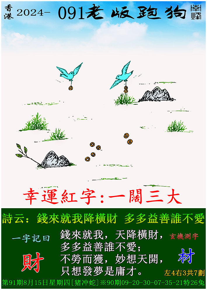 091期老版跑狗一字記之曰:【財】 玄機測字:《材》