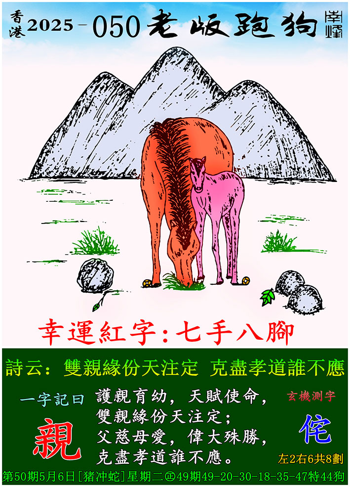 050期老版跑狗一字記之曰:【親】 玄機測字:《侘》