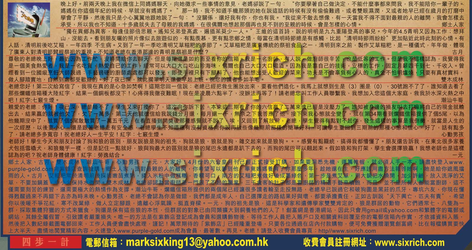 【5】親愛的老總:你好!夜已深,總是睡不了,學生又來打擾你了,這次向你訴下苦,本來這三期看了你的六信贏了二萬來塊已經是沒壓力了,誰知被身邊的損友叫去打嘛將自己的現金就輸出去,結果贏的就被他欠了,欠了一萬多,第二天他就微信給我說錢分月還,每月還一千,無奈之下我答應了他,接下來我心態就全變了,就在第34期看到爛鐵信箱提供了個5尾,以為他幾期沒中了,就買了個5尾敢敢買了一萬五千元,在看直播到開獎後那種感覺就不說了,唉,又回到了解放前,老總,學生覺得有點對不起你,發生這樣的事算是我倒黴,就當是人生的一次經歷,以後要小心,還是跟著老總走有安全感,老總學生不知道有沒有資格向你說再放些像幾期前那樣的簡單好料,可讓學生重回到三期前的那種心態和信心,好了,話有點多了,請老總多多寬容!祝老總好人一生平安!紅字:七竅生煙。    ---心動男孩