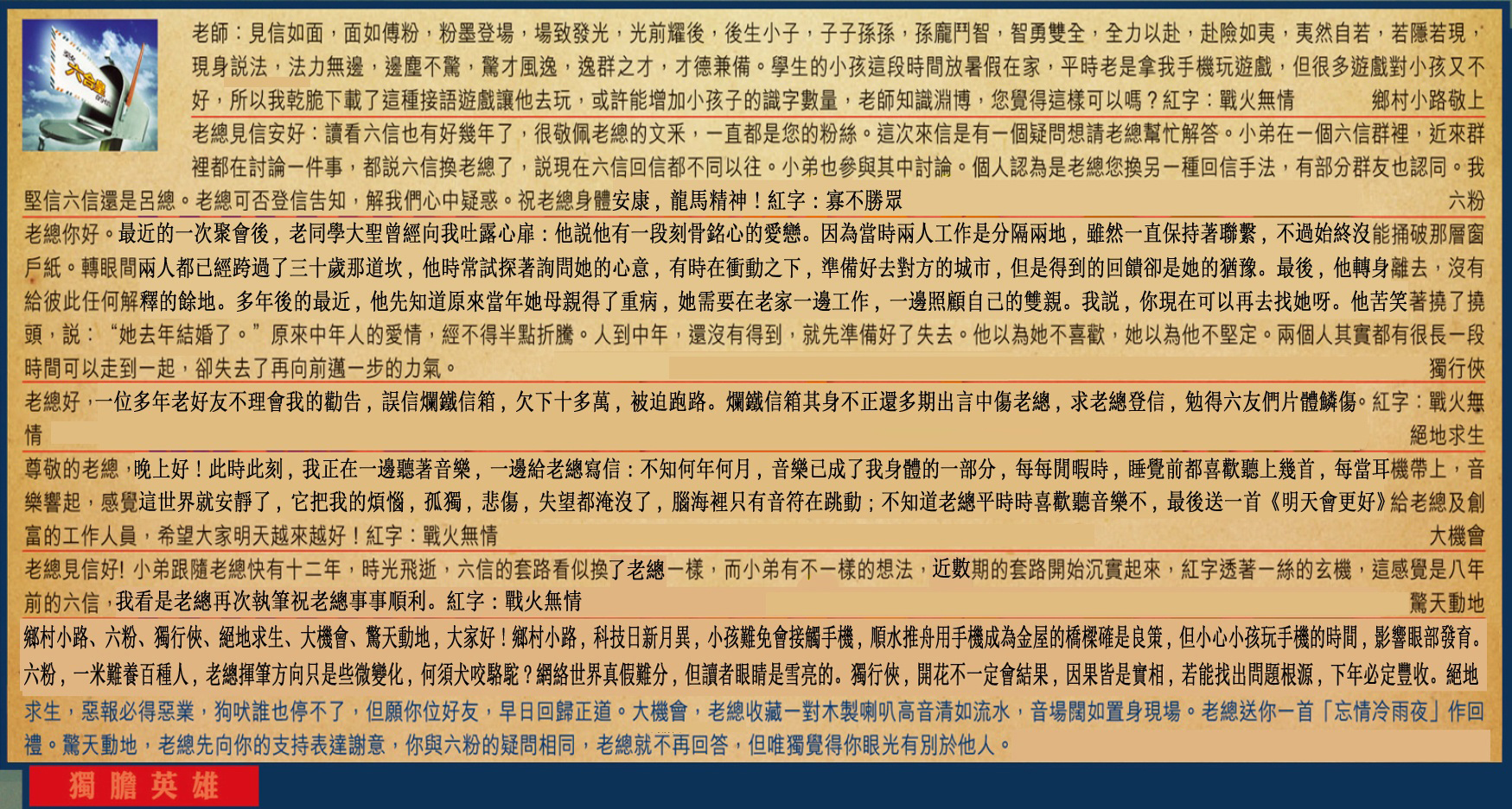 【2】.老總見信安好:讀看六信也有好幾年了,很敬佩老總的文采,一直都是您的粉絲。這次來信是有一個疑問想請老總幫忙解答。小弟在一個六信群裡,近來群裡都在討論一件事,都說六信換老總了,說現在六信回信都不同以往。小弟也參與其中討論。個人認為是老總您換另一種回信手法,有部分群友也認同。我堅信六信還是呂總。老總可否登信告知,解我們心中疑惑。祝老總身體健康,龍馬精神!紅字:寡不勝眾  六粉