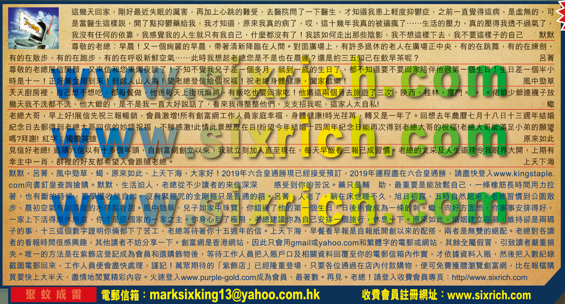 【6】.見信好老總!追隨六信以有十多個年頭,自創富網創立以來,我就立刻加入直至現在,每天早飯看三報已成習慣。老總的文采及人生道理令我眼界大開,上期有幸主中一肖,群裡的好友都希望入會跟隨老總。  上天下海
