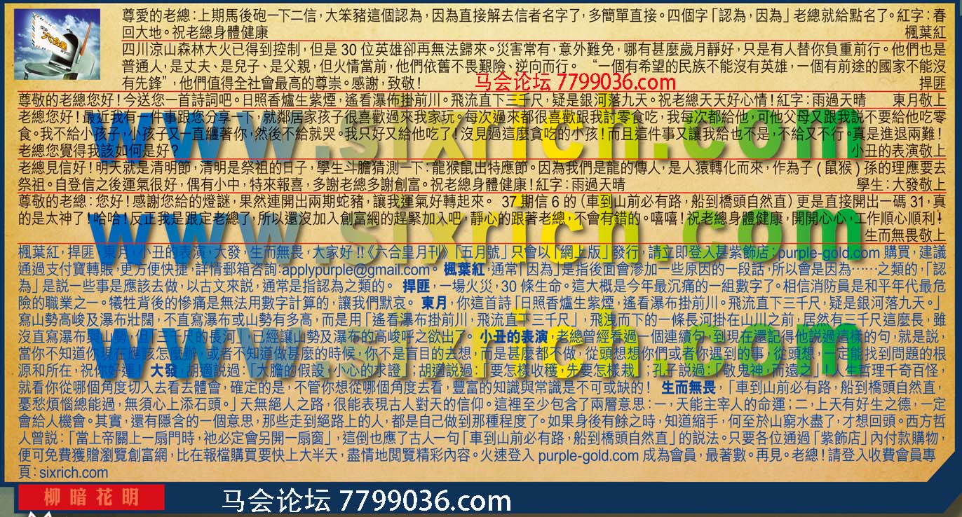 【1】尊愛的老總:上期馬後硇一下二信,大笨豬這個認為,因為直接解去信者名字了,多簡單直接。四個字「認為,因為」老總就給點名了。紅字:春回大地。祝老總身體健康 ---楓葉紅