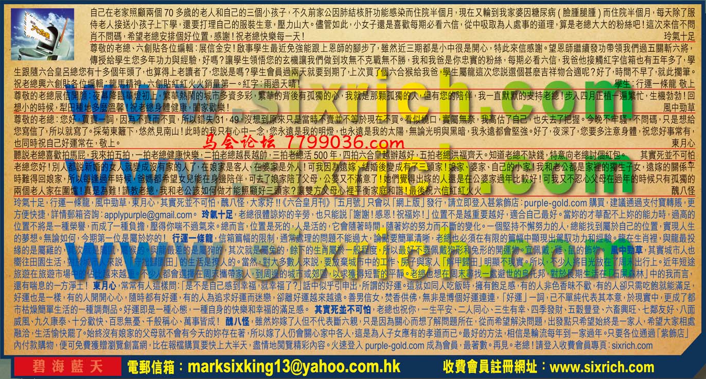 【1】自己在老家照顧兩個70多歲的老人和自己的三個小孩子,不久前家公因肺結核肝功能感染而住院半個月,現在又輪到我家婆因糖尿病(臉腫腿腫)而住院半個月,每天除了服侍老人接送小孩子上下學!還要打理自己的服装生意,壓加山大。儘管如此,小女子還是喜歡每期必看六信,從中吸取為人處事的道理,算是老總大大的粉絲吧!這次來信不問肖不問碼:希望老總安排個好位置,感謝!祝老總快樂每一天! ---玲氣十足