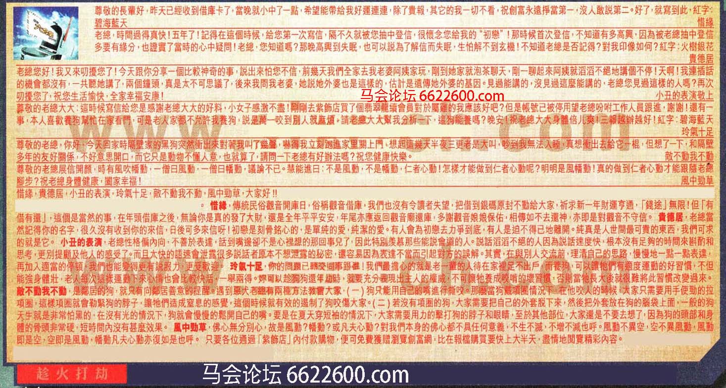 【2】老總,時間過得真快!五年了!記得在這個時候,給您第一次寫信,隔不久就被您抽中登信,很懷念您给我的“初戀”!那時候首次登信 ,不知道有多高興,因為被老總抽中登信多要有緣分,也證實了當時的心中疑問!老總,您知道嗎?那晚高興到失眠,也可以說為了解信而失眠,生怕解不到玄機!不知道老總是否記得?對我印像如何?紅字:火樹銀花 ---貴德居