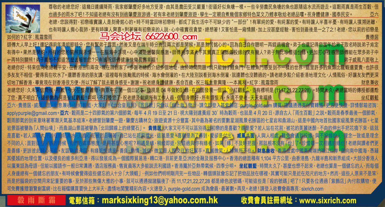 【5】老總您好:久未來信問侯,抱歉!今天在整理雜物,無意中打開-個日記本,發現是04年做的記録,在裡面發現-個詞“坐紅觀藍”, 並有標明是(11,17,21,22,27,28)。 時間太久,老總當時的傳授都還給了您,真不明白了,這些數為何是坐紅觀藍!呵呵,不打擾悠了,祝老總及創網所有工作人員個個身體好,所有煩惱消,永遠不變老,天天幸福繞 ---坐紅觀藍