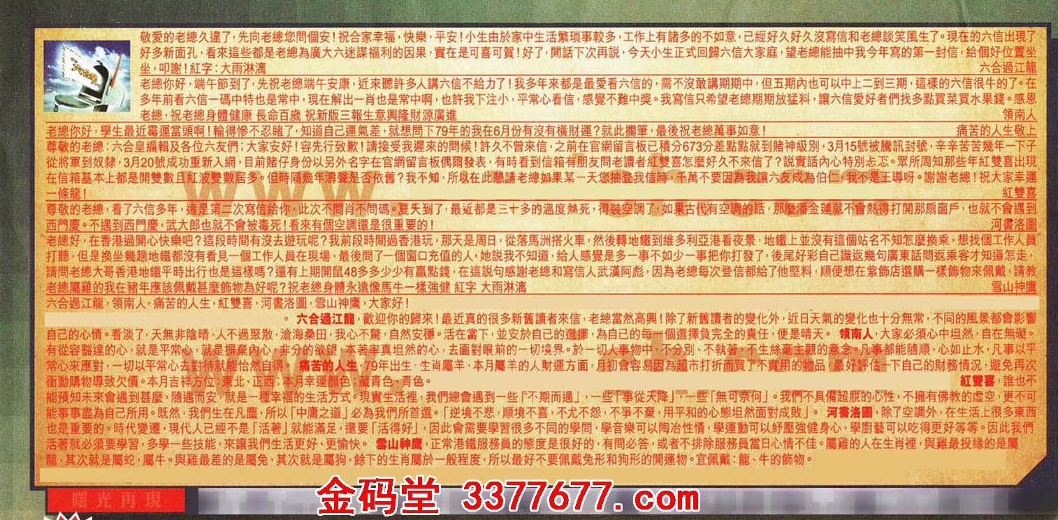 【1】敬愛的老總久違了,先向老總您問個安!祝合家幸福,快樂,平安!小生由於家中生活繁瑣事較多,工作上有諸多的不如意,已經好久好久沒寫信和老總談笑風生了。現在的六信出現了好多新面孔,看來這些都是老總為廣大六迷謀福利的因果,實在是可喜可賀!好了,聞話下次再說,今天小生正式回歸六信大家庭,望老總能抽中我今年寫的第一封信,給個好位置坐坐,叩谢!紅字:大雨淋漓 ---六合過江龍