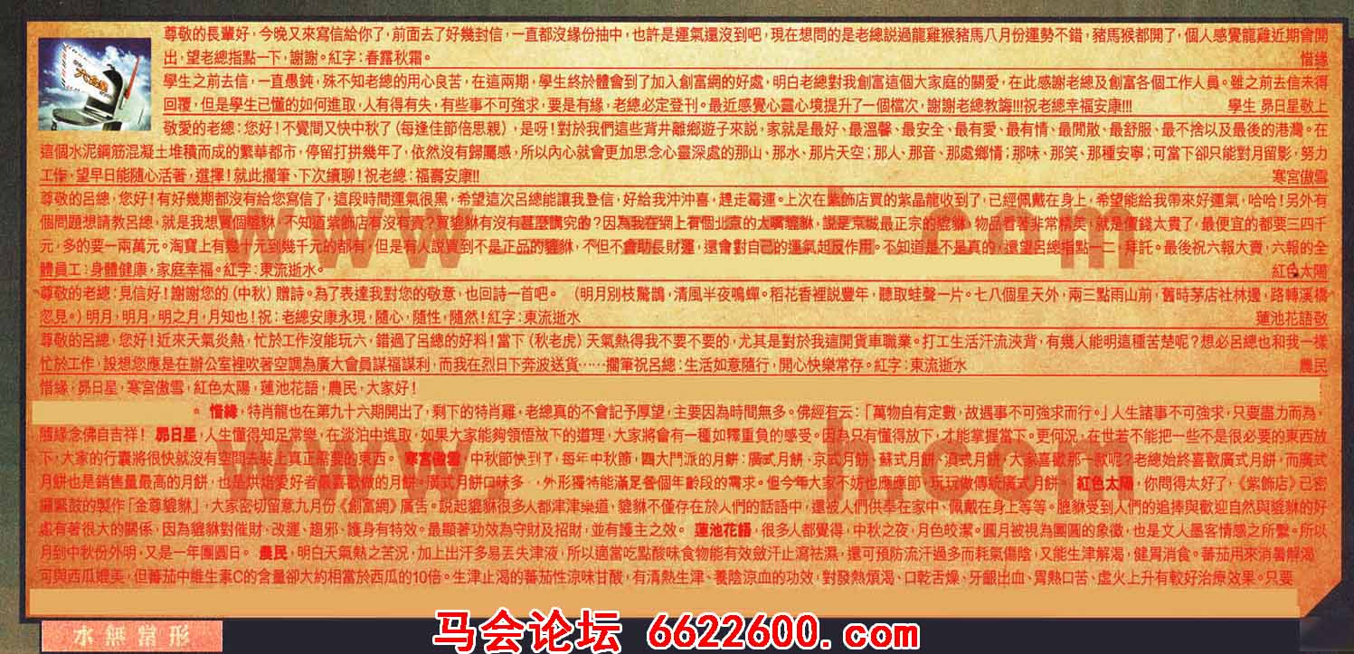 【6】尊敬的呂總,您好!近來天氣炎熱, 忙於工作沒能玩六,错過了呂總的好料!當下 (秋老虎)天氣熱得我不要不要的,尤其是對於我這開貨車職業。打工生活汗流浹背 ,有幾人能明這種苦楚呢?想必呂總也和我一樣忙於工作,設想您應是在辦公室裡吹著空調為廣大會員謀福謀利 而我在烈日下奔波送货.....擱筆祝呂總:生活如意随行,開心快樂常存。紅字:東流逝水 --- 農民