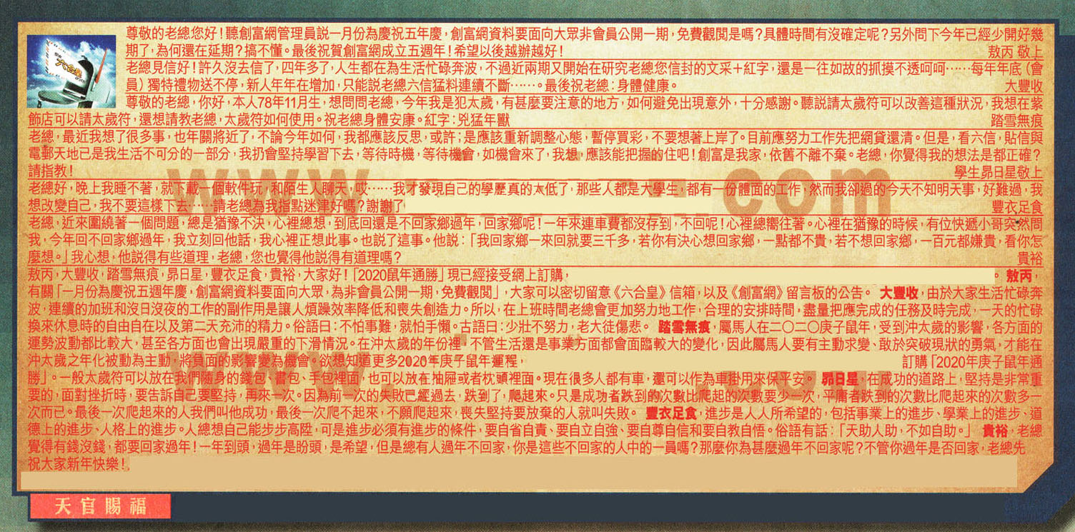 →〖敖丙〗:有關「一月份為慶祝五週年慶,創富網資料要面向大眾,為非會員公開一期,免費觀閱」,大家可以密切留意《六合皇》信箱,以及《創富網》留言板的公告
