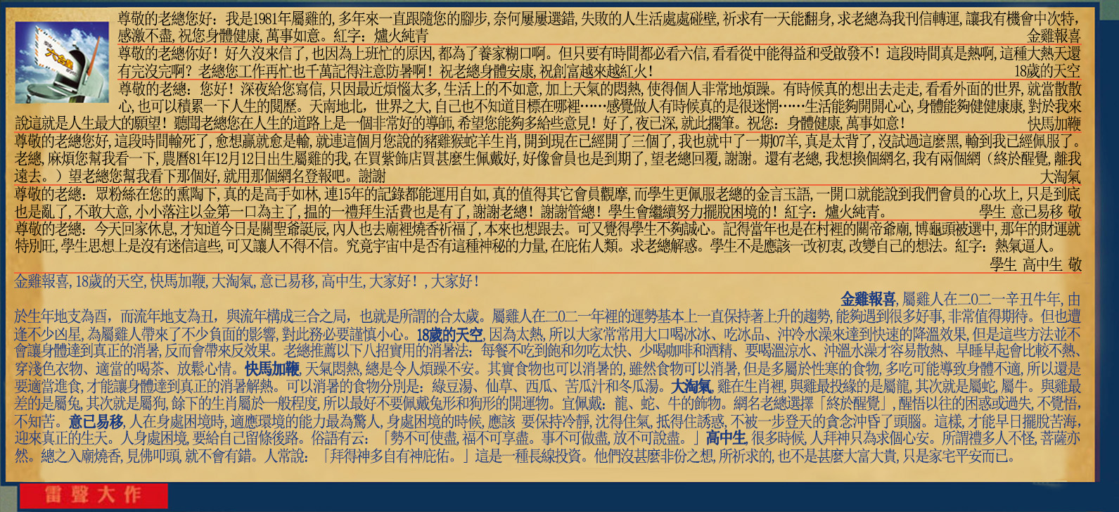 【1】.尊敬的老總您好:我是1981年屬雞的,多年來一直跟隨您的腳步,奈何屢屢選錯,失敗的人生活處處碰壁,祈求有一天能翻身,求老總為我刊信轉運,讓我有機會中次特,感激不盡,祝您身體健康,萬事如意。紅字:爐火純青 金雞報喜