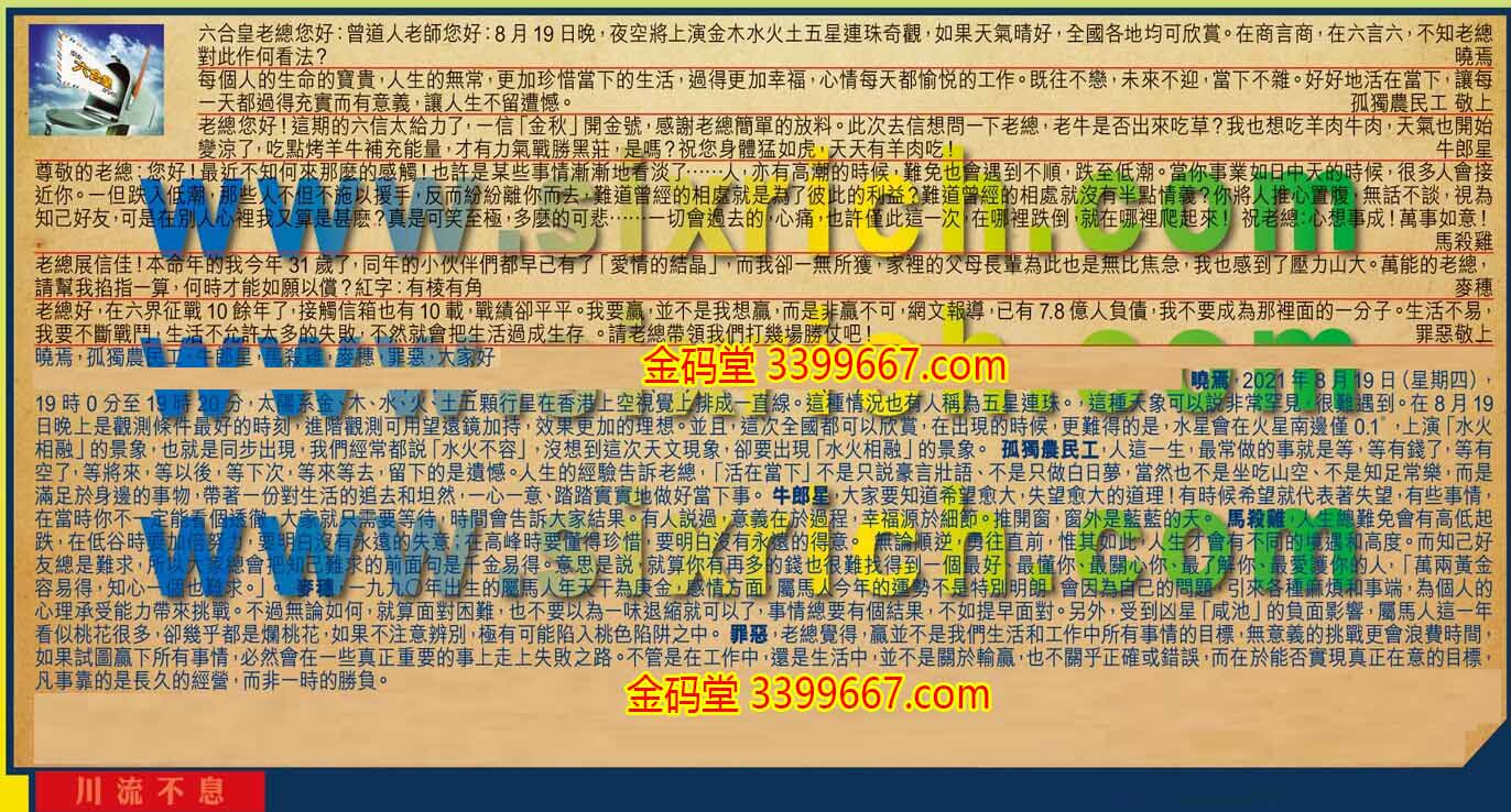 【1】.六合皇老總您好:曾道人老師您好:8月19日晚,夜空將上演金木水火土五星連珠奇觀,如果天氣晴好,全國各地均可欣賞。在商言商,在六言六,不知老總對此作何看法?  曉焉