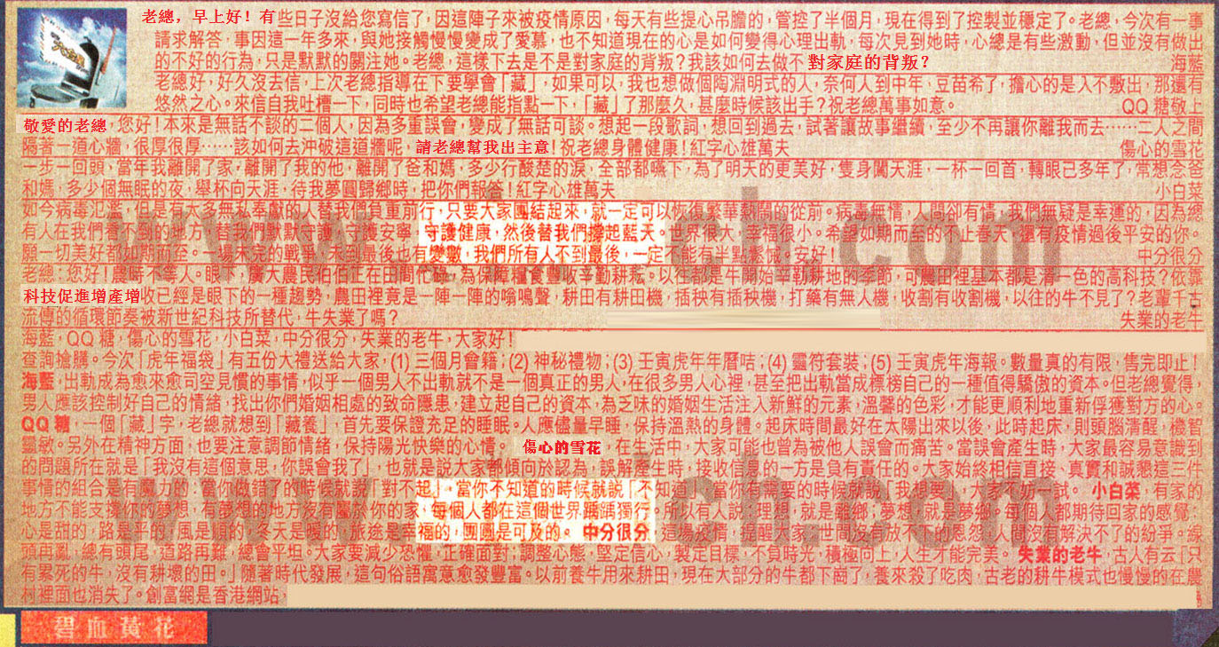 【3】.敬爱的老總!您好!本來是無話不談的二個人,因為多重誤會,變成了無話可談。想起一段歌詞,想回到過去,試蓍讓故事繼續,至少不再讓你離我而去......人之間隔著一道心牆,很厚很厚......該如何去沖破這道牆呢,請老總幫我出主意!祝老總身體健康!紅字心雄萬夫  傷心的雪花
