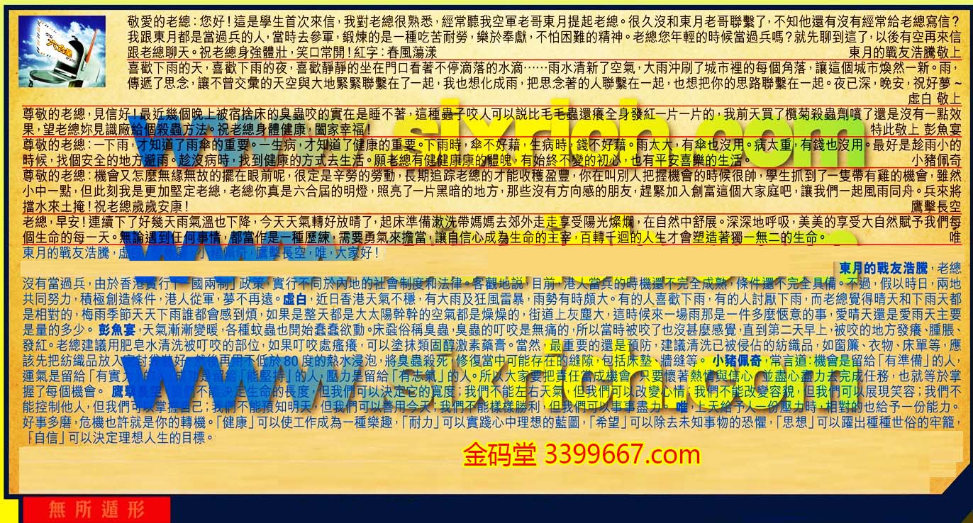 【1】.敬愛的老總:您好!這是學生首次來信,我對老總很熟悉,經常聽我空軍老哥東月提起老總。很久沒和東月老哥聯繫了,不知他還有沒有經常給老總寫信?我跟東月都是當過兵的人,當時去參軍,鍛煉的是一種吃苦耐勞,樂於奉獻,不怕困難的精神。老總您年輕的時候當過兵嗎?就先聊到這了以後有空再來信跟老總聊天。祝老總身強體壯,笑口常開!紅字:春風蕩漾 東月的戰友浩騰敬上