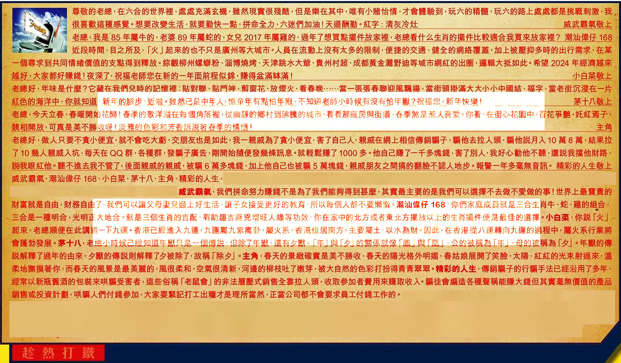 【6】.老總好,做人只要不贪小便宜,就不會吃大虧,交朋友也是如此,我一親戚為了贪小便宜 ,害了自己人,親戚在網上相信傳銷騙子,騙他去拉人頭,騙他說月入 10 萬 8 萬,結果拉了 10 幾人親戚入坑,每天在QQ群,各種群,發騙子廣告,剛開始隨便發幾條訊息。就輕鬆賺了 1000 多。他自己賺了一千多塊錢,害了别人,我好心勸他不聽,還說我擋他財路說我眼紅他。聽不進去我不管了,後面親戚的親戚,被騙 6 萬多塊錢,加上他自己也被騙 5 萬塊錢,親戚朋友之間搞的翻臉不認人地步。報警一年多毫無音訊。 精彩的人生敬上