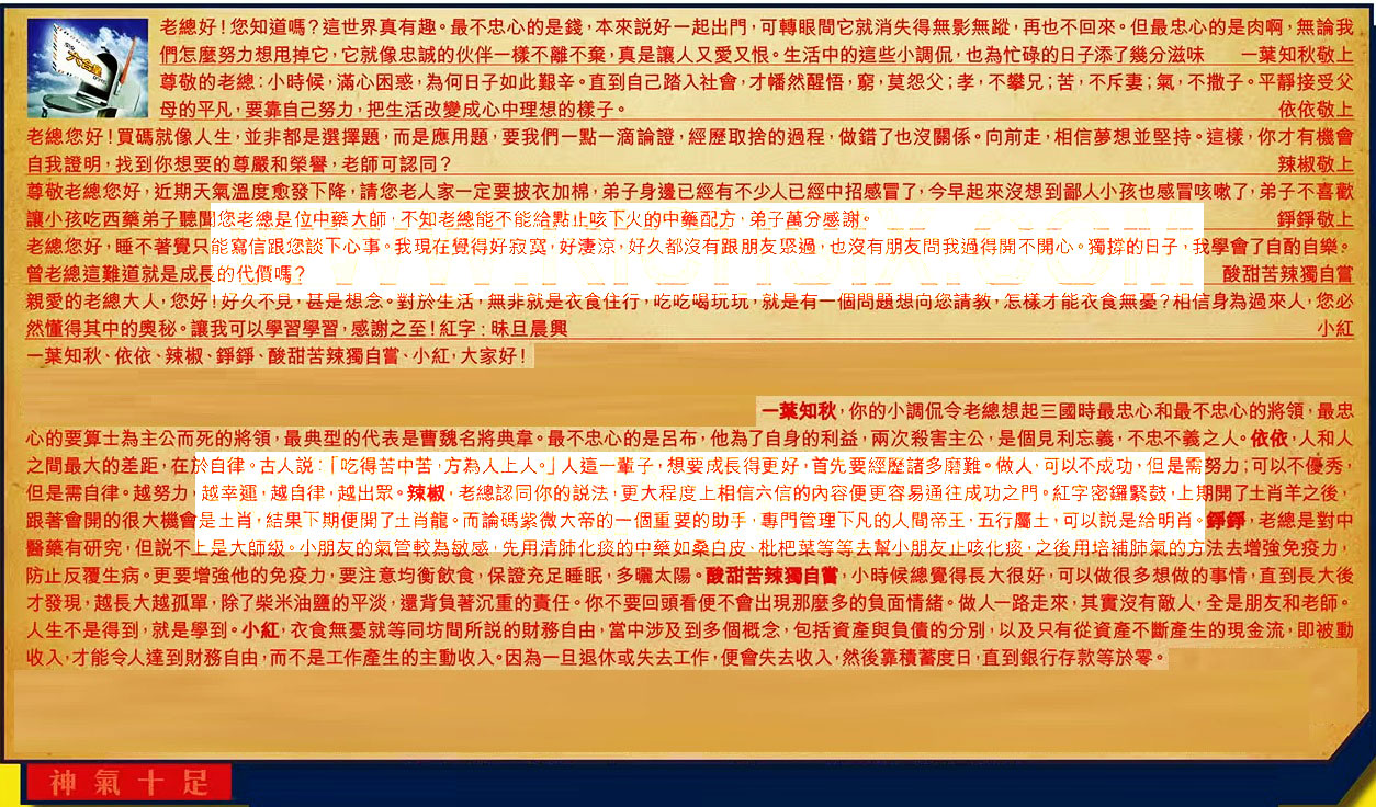 【6】.親愛的老總大人,您好!好久不見,甚是想念。對於生活,無非就是衣食住行,吃吃喝玩玩,就是有一個問題想向您請教,怎樣才能衣食無憂?相信身為過來人您必然懂得其中的奧秘。讓我可以學習學習,感謝之至!紅字:昧且晨興 小紅
