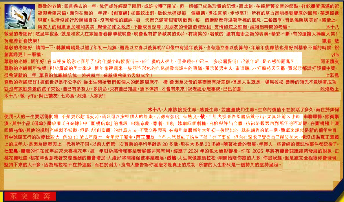 【1】.尊敬的老總:回首過去的一年,我們或許經歷了風雨,或許收穫了陽光,但一切都已成為珍貴的記憶。而此刻,在這新舊交替的節點,祥蛇攜著滿滿的祝福與希望來臨。願你在新的一年裡,【創富網】如靈蛇出洞,敏銳地捕捉每一個機遇,勇往直前,步步高升,所有的努力都能得到豐厚的回報,夢想照進現實。生活似蛇行般順暢自在,沒有煩惱的羈絆,每一天都充滿著甜蜜與歡樂,每一個瞬間都洋溢著幸福的氣息,三餐四季,皆是溫暖與美好。感情上,與家人的相處更加和和美美,親情如蛇之蜕皮,不斷成長深厚;與朋友的情誼愈發堅固,友情如蛇之堅韌,經得起時間的考驗。 木十八