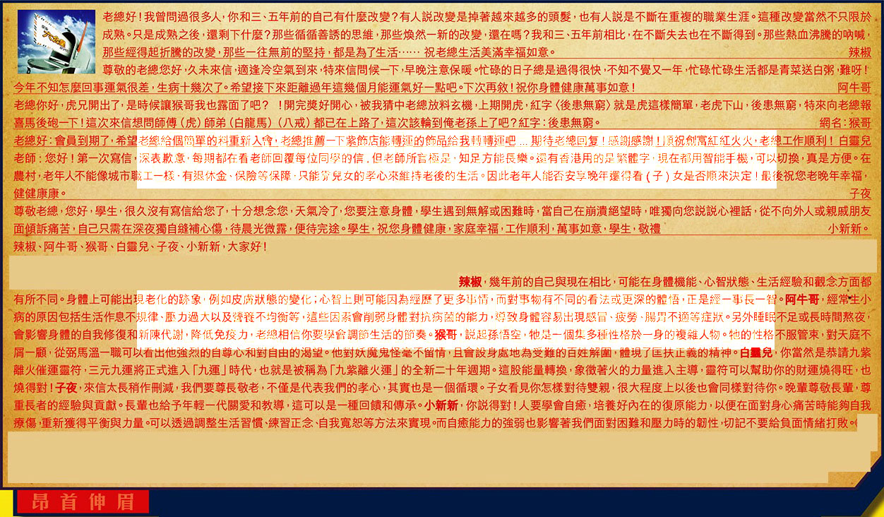 【3】.老總你好,虎兄開出了,是時候讓猴哥我也露面了吧?!開完獎好開心,被我猜中老總放料玄機,上期開虎,紅字《後患無窮》就是虎這樣簡單,老虎下山,後患無窮特來向老總報喜馬後饱一下!這次來信想問師傅(虎)師弟(白龍馬) (八戒)都已在上路了,這次該輪到俺老孫上了吧?紅字:後患無窮。 網名:猴哥