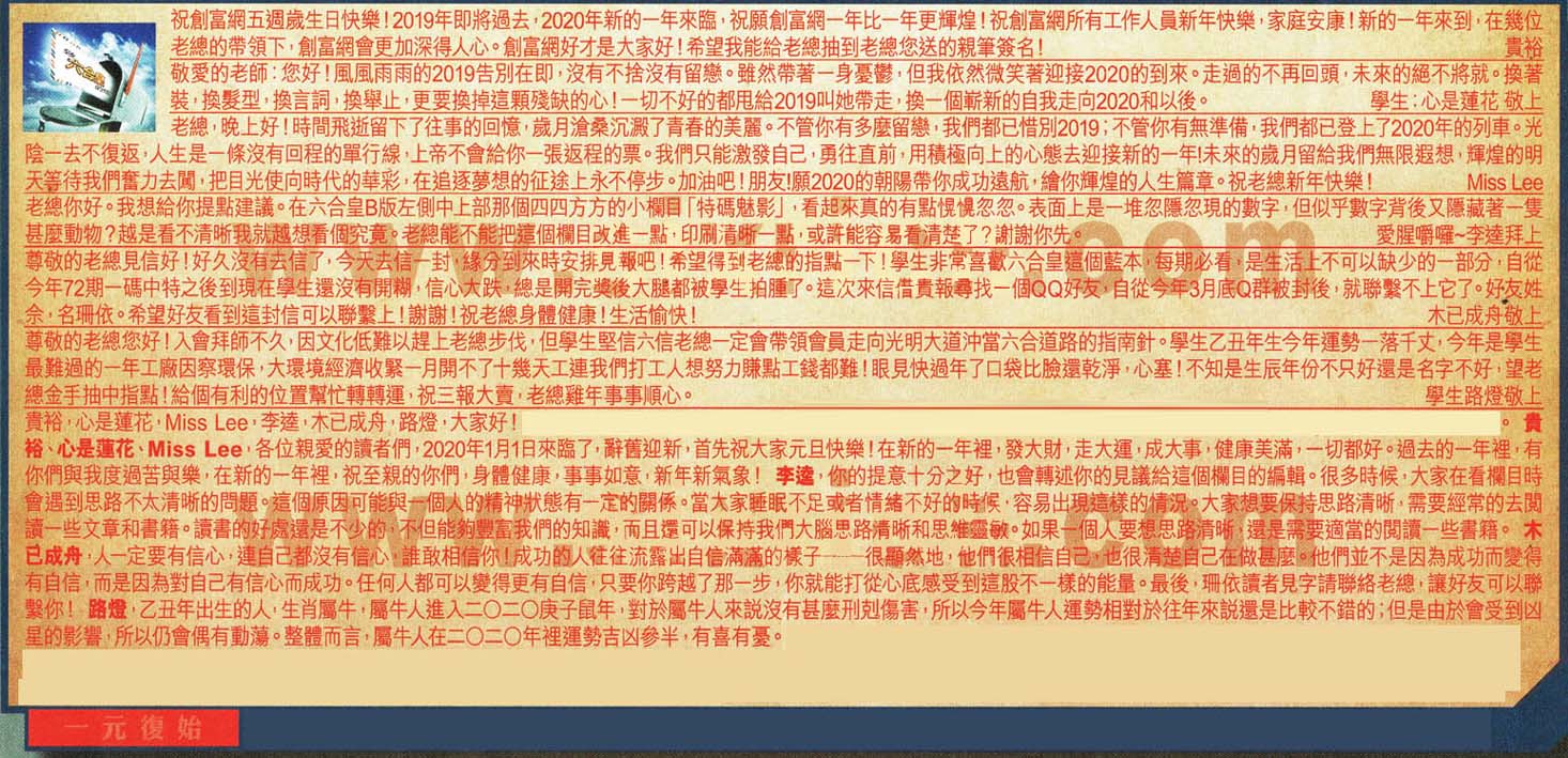 【1】.祝創富網五週歲生日快樂!2019年即將過去,2020年新的一年來臨,祝願創富網一年比一年更輝煌!祝創富網所有工作人員新年快樂,家庭安康!新的一年來到,在幾位老總的帶領下,創富網會更加深得人心。創富網好才是大家好!希望我能給老總抽到老總您送的親筆簽名!    貴裕