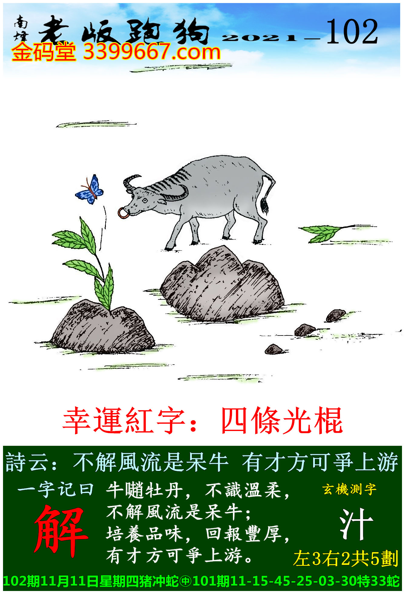 102期老版跑狗一字記之曰:【解】玄機測字:《汁》