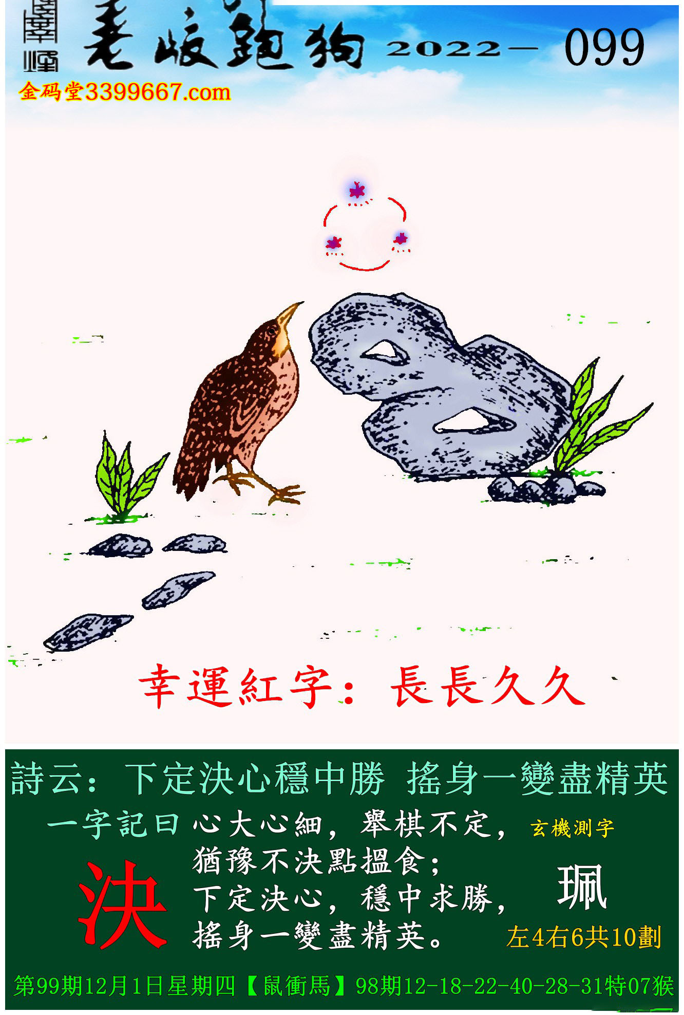 099期老版跑狗一字記之曰:【決】玄機測字:《珮》