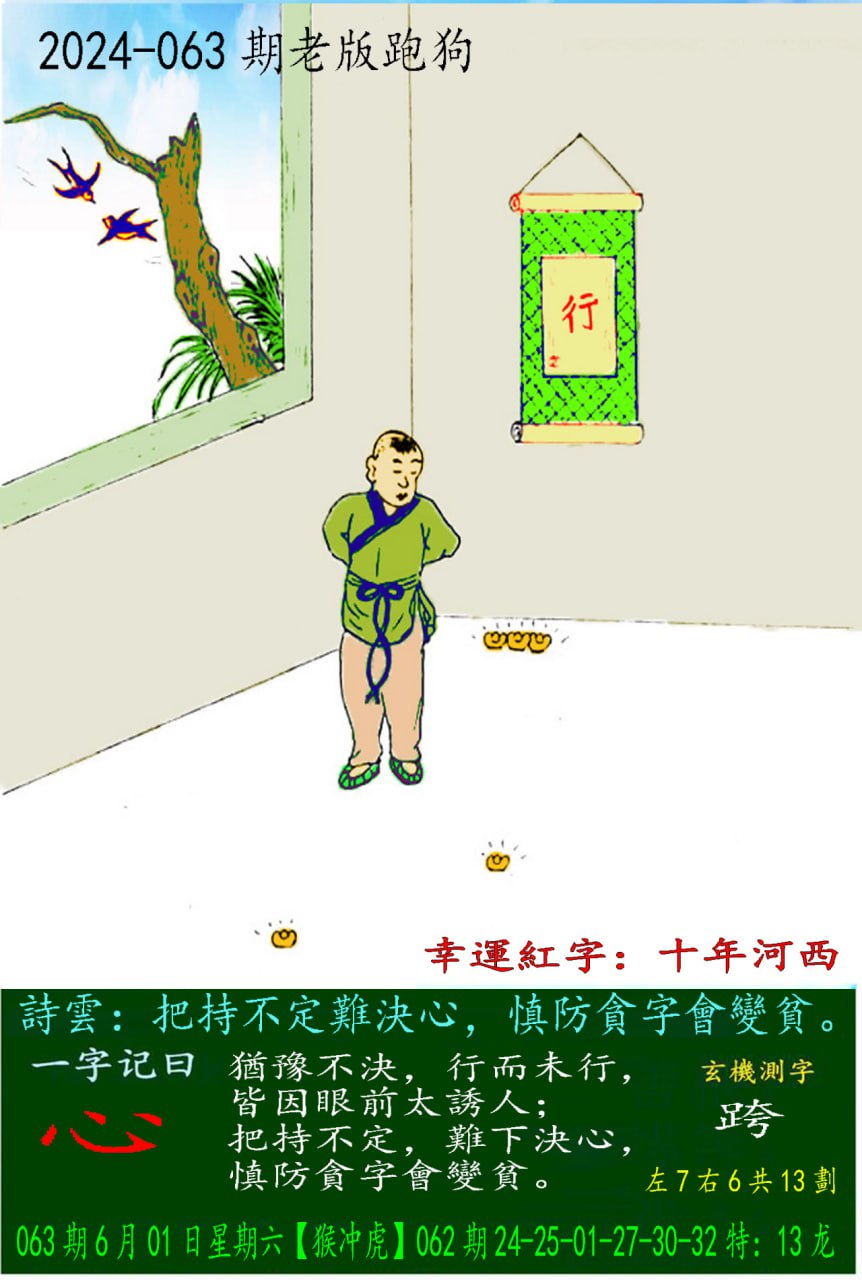 063期老版跑狗一字記之曰:【心】 玄機測字:《跨》