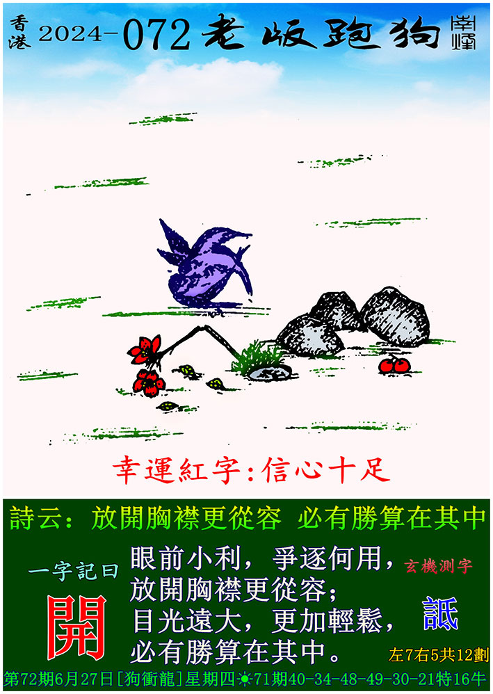 主题 : 072期老版跑狗一字記之曰:【開】 玄機測字:《詆》