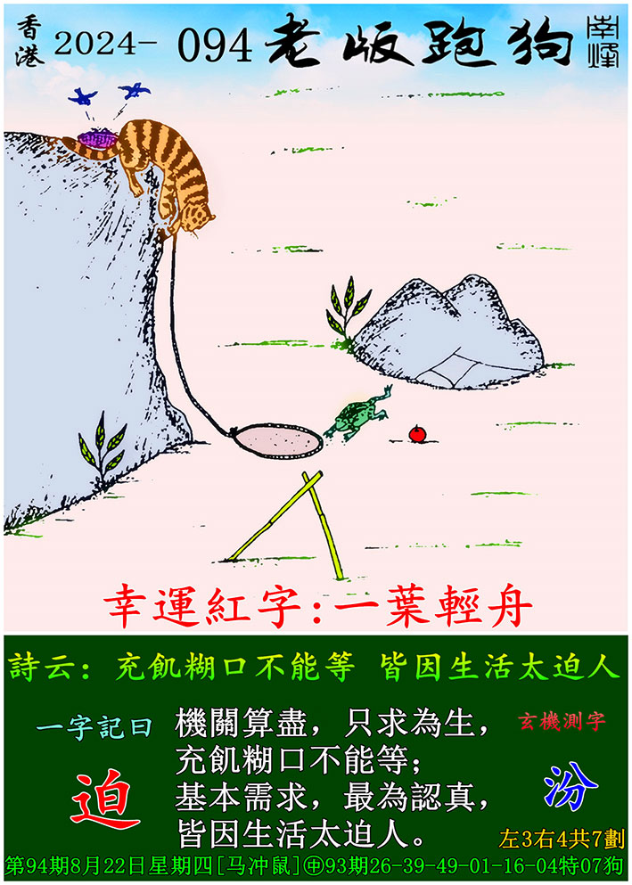 094期老版跑狗一字記之曰:【迫】 玄機測字:《汾》