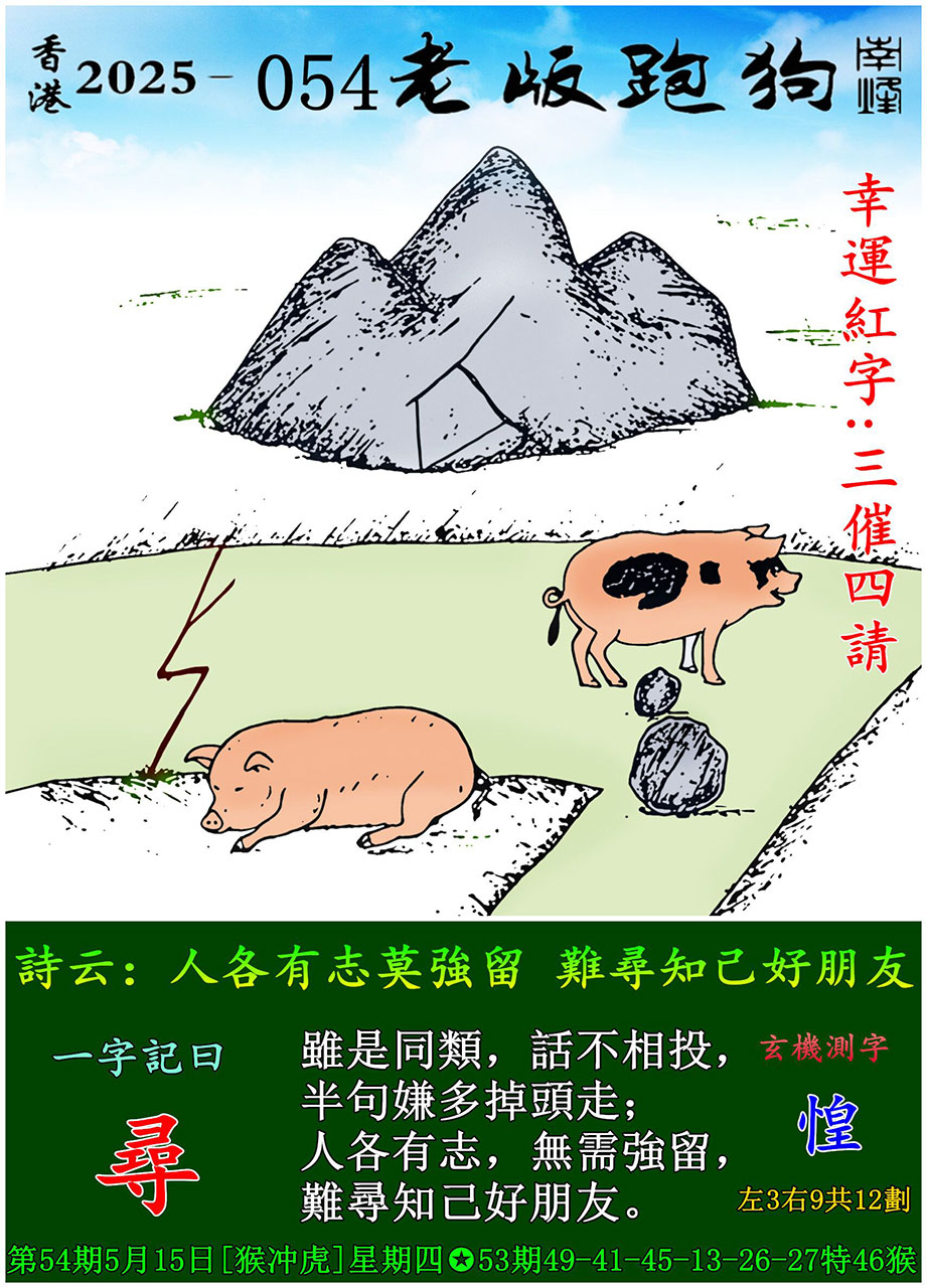 054期老版跑狗一字記之曰:【尋】 玄機測字:《惶》