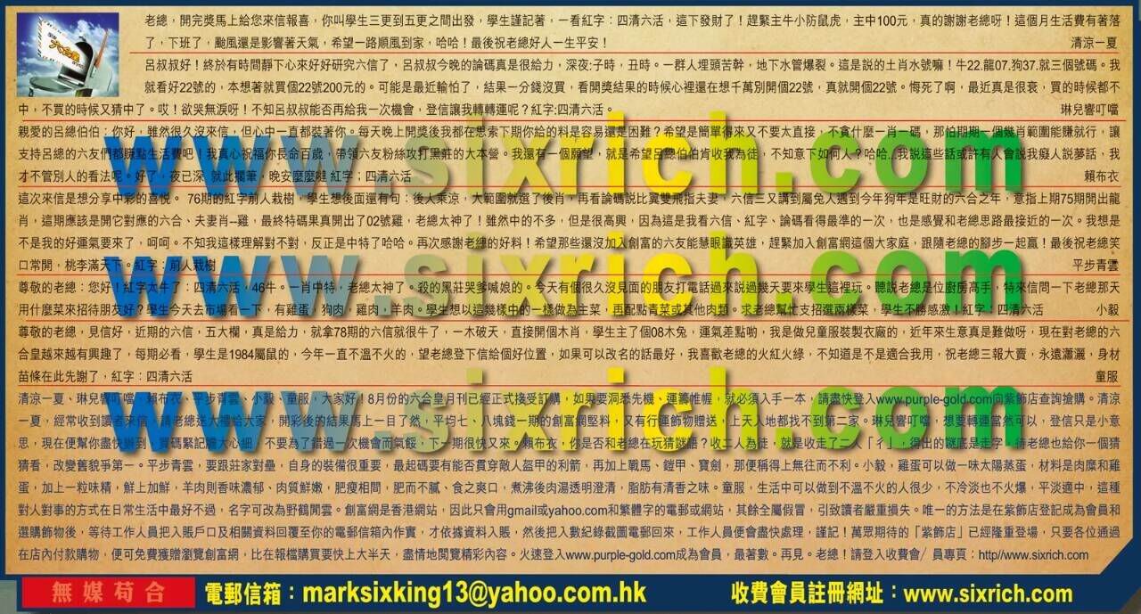 【6】.尊敬的老總,見信好,近期的六信,五大欄,真是給力,就拿78期的六信就很牛了,一木破天,直接開個木肖,學生主了個08木兔,運氣差點喲,我是做兒童服裝製衣廠的,近年來生意真是難做呀,現在對老總的六合皇越來越有興趣了,每期必看,學生是1984屬鼠的,今年一直不溫不火的,望老總登下信給個好位置,如果可以改名的話最好,我喜歡老總的火紅火綠,不知道是不是適合我用,祝老總三報大賣,永遠瀟灑,身材苗條在此先謝了,紅字:四清六活  童服