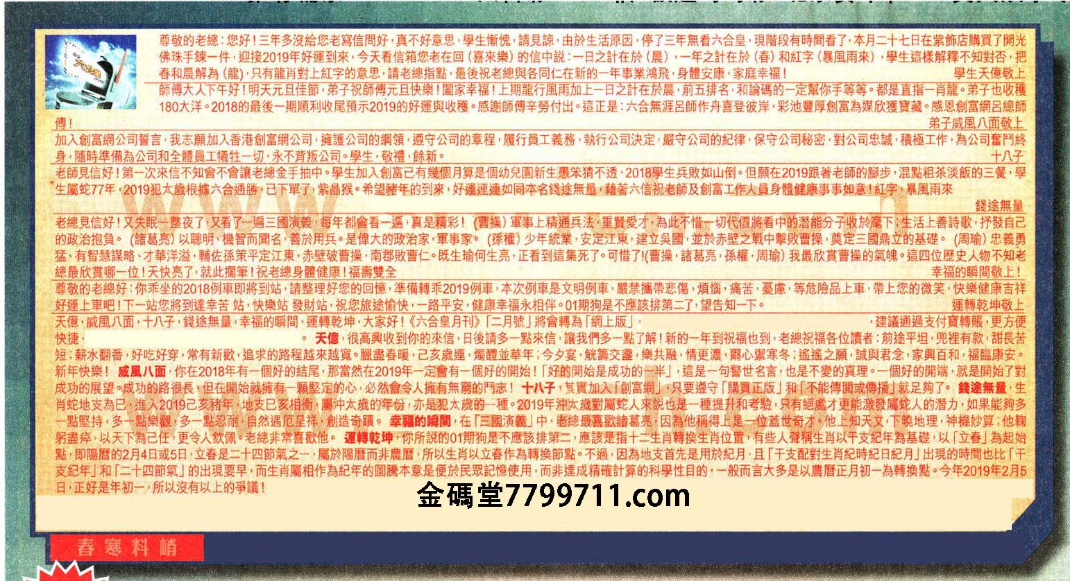【1】尊敬的老總:您好!三年多沒給您老寫信問好,真不好意思,學生慚愧,請見諒,由於生活原因,停了三年無看六合皇,現階段有時間看了,本月二十七日在紫飾店購買了開光佛珠手練一件.迎接2019年好運到來,今天看信箱您老在回(喜來樂)的信中說:一日之計在於(晨),一年之計在於(春)和紅字(暴風雨來) .學生這樣解釋不知對否,把春和晨解為(龍),只有龍肖對上紅字的意思,請老總指點,最後祝老總與各同仁在新的一年事業鴻飛,身體安康,家庭幸福!    ---學生天億敬上