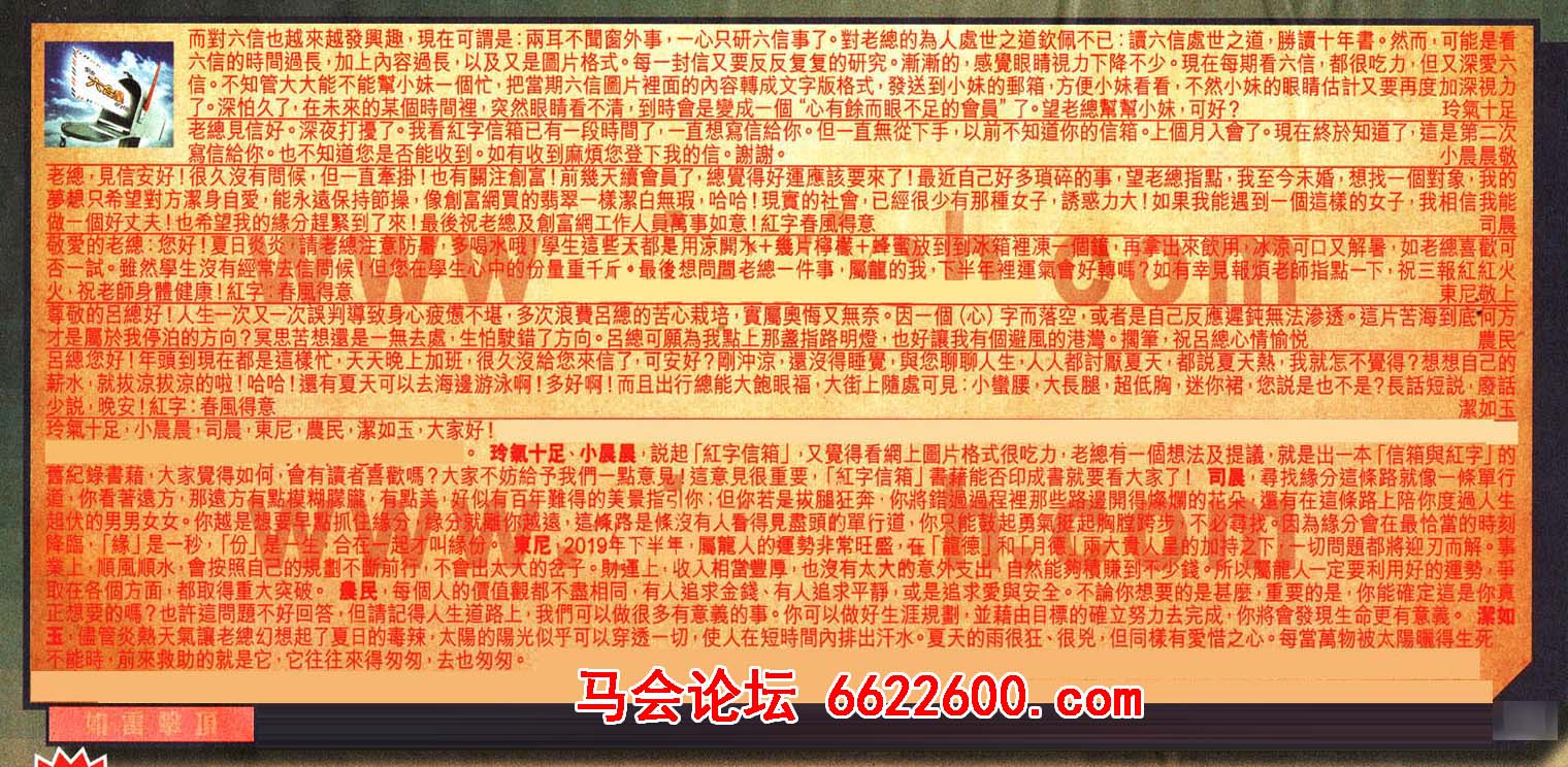 【1】而對六信也越來越發興趣,現在可謂是:兩耳不聞窗外事,一心只研六信事了。對老總的為人處世之道欽佩不已:讀六信處世之道,勝讀十年書。然而,可能是看六信的時間過長,加上内容過長,以及又是圖片格式。每一封信又要反反复复的研究。漸漸的,感覺眼睛視力下降不少。現在每期看六信,都很吃力,但又深愛六信。不知管大大能不能幫小妹一個忙,把當期六信圖片裡面的內容轉成文字版格式,發送到小妹的郵箱,方便小妹看看,不然小妹的眼睛估計又要再度加深視力了。深怕久了,在未來的某個時間裡,突然眼睛看不清;到時會是變成一個“心有餘而眼不足的會員”了。望老總幫幫小妹,可好? ---玲氣十足