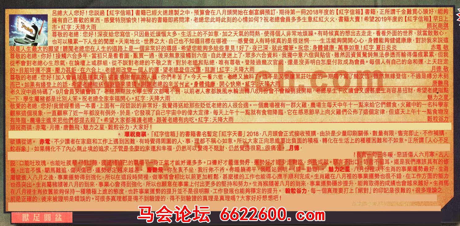 【1】呂總大人您好!您說過[紅字信箱]書籍已經火速趕裂之中,預算會在八月頭開始在創富綱預訂,期待第一冊2018年度的 [紅字信箱]書籍,正所謂千金難買心頭好,能夠擁有自己喜歡的東西,感覺特別愉快!神秘的書籍即將問津,老總您此時此刻的心情如何?祝老總會員多多生意紅紅火火,書籍大賣!希望2019年度的[紅字信箱]早日上市。红字:天降大雨 --- 順祝商祺