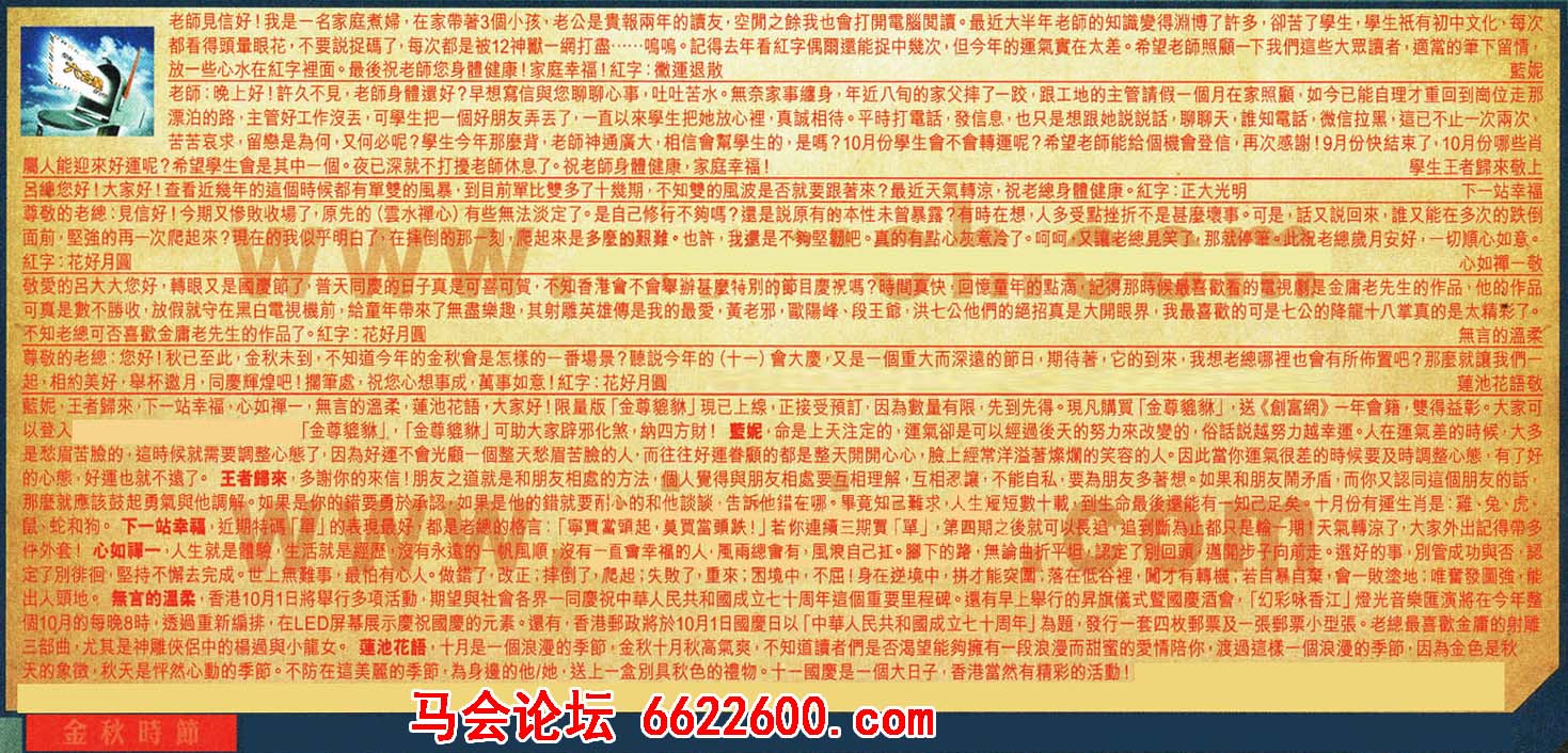 【1】.老師見信好!我是一名家庭煮婦,在家帶著3個小孩,老公是貴報兩年的讀友,空閒之餘我也會打開電腦閱讀。最近大半年老師的知識變得淵博了許多,卻苦了學生,學生祇有初中文化,每次都看得頭暈眼花,不要説捉碼了,每次都是被12神獸一網打盡……嗚嗚。記得去年看紅字偶爾還能捉中幾次,但今年的運氣實在太差。希望老師照顧一下我們這些大眾讀者,適當的筆下留情,放一些心水在紅字裡面。最後祝老師您身體健康!家庭幸福!紅字:黴運退散    藍妮