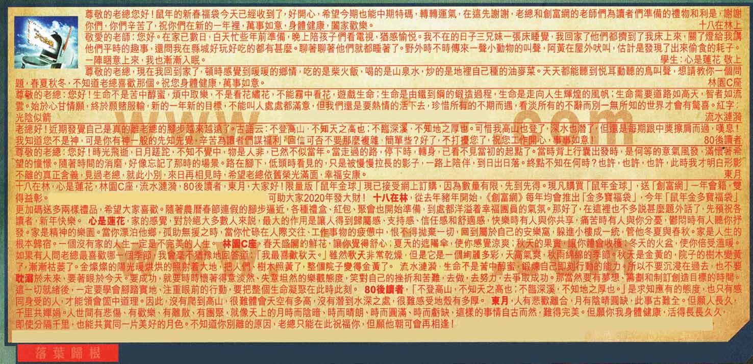 【1】尊敬的老總您好!鼠年的新春福袋今天已經收到了,好開心,希望今期也能中期特碼轉轉運氣,在這先謝謝,老總和創富網的老師們為讀者們準備的禮物和利是謝謝你們,你們辛苦了,祝你們在新的一年裡,萬事如意,身體健康;闔家歡樂。-----十八在林上