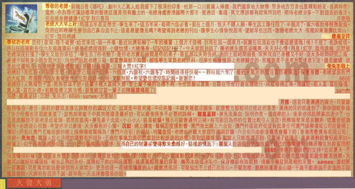 【2】.老總大大早上好:時隔五年甚至想念,學生來了。這五年來,每期六信必看。就在上個月,恨天下不隨人願,學生因工傷住院了,半個月了,第六根肋骨輕微裂痕。突然在昨晚學生夢到自己鼻血流不止,這是甚麼徵兆嗎?希望得到老總的刊出,讓學生心情愉悅起來,望能早些出院。謝謝老總大大,祝福如東海壽比南山!紅字,陰雨綿綿    龍鳳呈祥