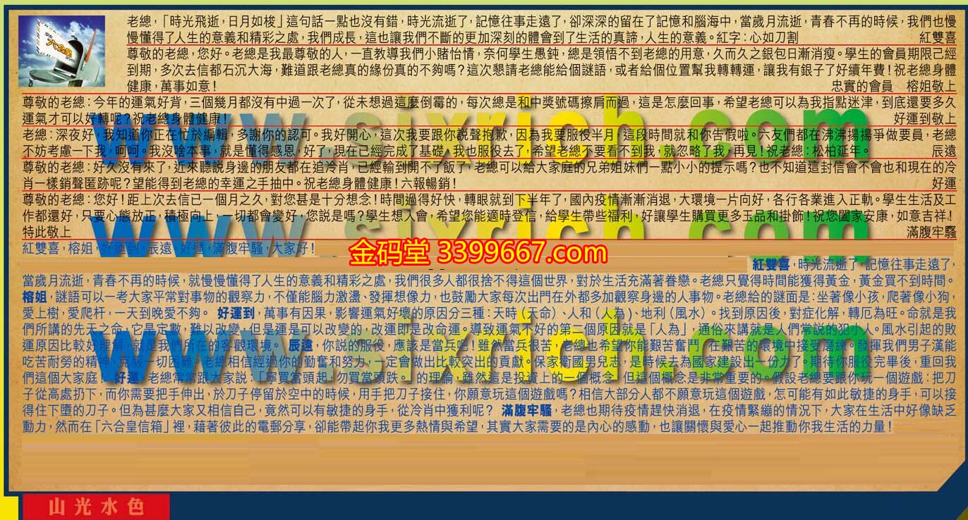 【2】.尊敬的老總,您好。老總是我最尊敬的人,一直教導我們小賭怡情,奈何學生愚鈍,總是領悟不到老總的用意,久而久之銀包日漸消瘦。學生的會員期限己經到期,多次去信都石沉大海,難道跟老總真的緣份真的不夠嗎?這次懇請老總能給個謎語,或者給個位置幫我轉轉運,讓我有銀子了好續年費!祝老總身體健康,萬事如意!  忠實的會員  榕姐敬上