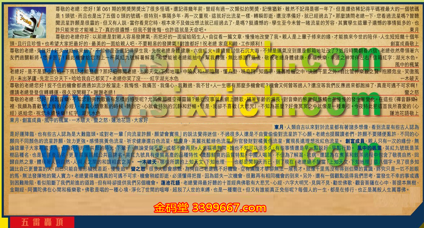 【1】.尊敬的老總:您好!第061期的開獎開獎出了很多怪碼。還記得幾年前,曾經有過一次類似的開獎,記憶猶新,雖然不記得是哪一年了,但是還依稀記得平碼裡最大的一個號碼是1頭號,而且也是出了五個0頭的號碼,很特別。事隔多年,再一次重現,這就好比流星一樣,轉瞬即逝,還沒準備好,就已經過去了。那麼請問老總一下,您看過流星嗎?曾聽聞流星許願是很靈的,但又有人說,當你看見它時,根本來不及做出想法就已經過去了,是嗎?挺遺憾的,學生至今未曾一睹流星的芳容,其實學生這輩子遺憾的事情挺多的,也許只能來世才能補上了,真的很遺憾,但我不曾後悔,也許這就是天命吧。  東月