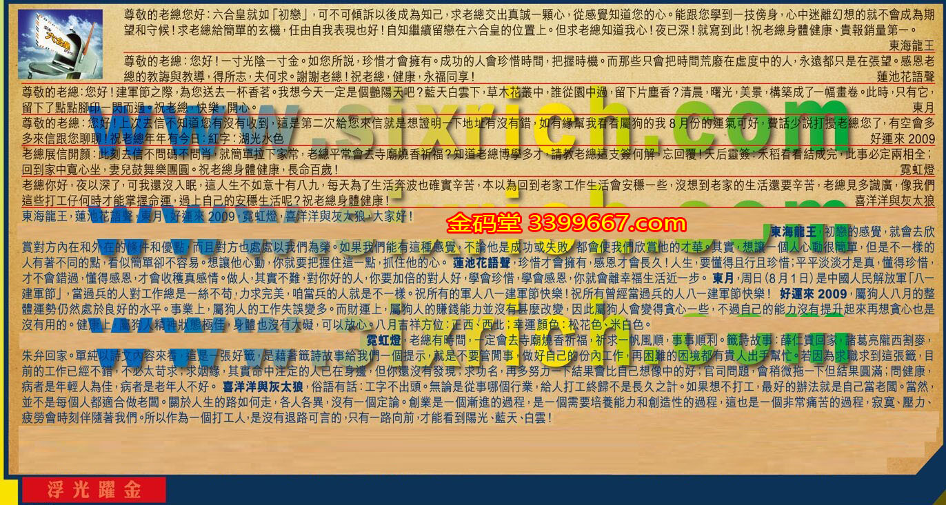 【1】.尊敬的老總您好:六he皇就如「初戀」,可不可傾訴以後成為知己,求老總交出真誠一顆心,從感覺知道您的心。能跟您學到一技傍身,心中迷離幻想的就不會成為期望和守候!求老總給簡單的玄機,任由自我表現也好!自知繼續留戀在六合皇的位置上。但求老總知道我心!夜已深!就寫到此!祝老總身體健康、貴報銷量第一。  東海龍王